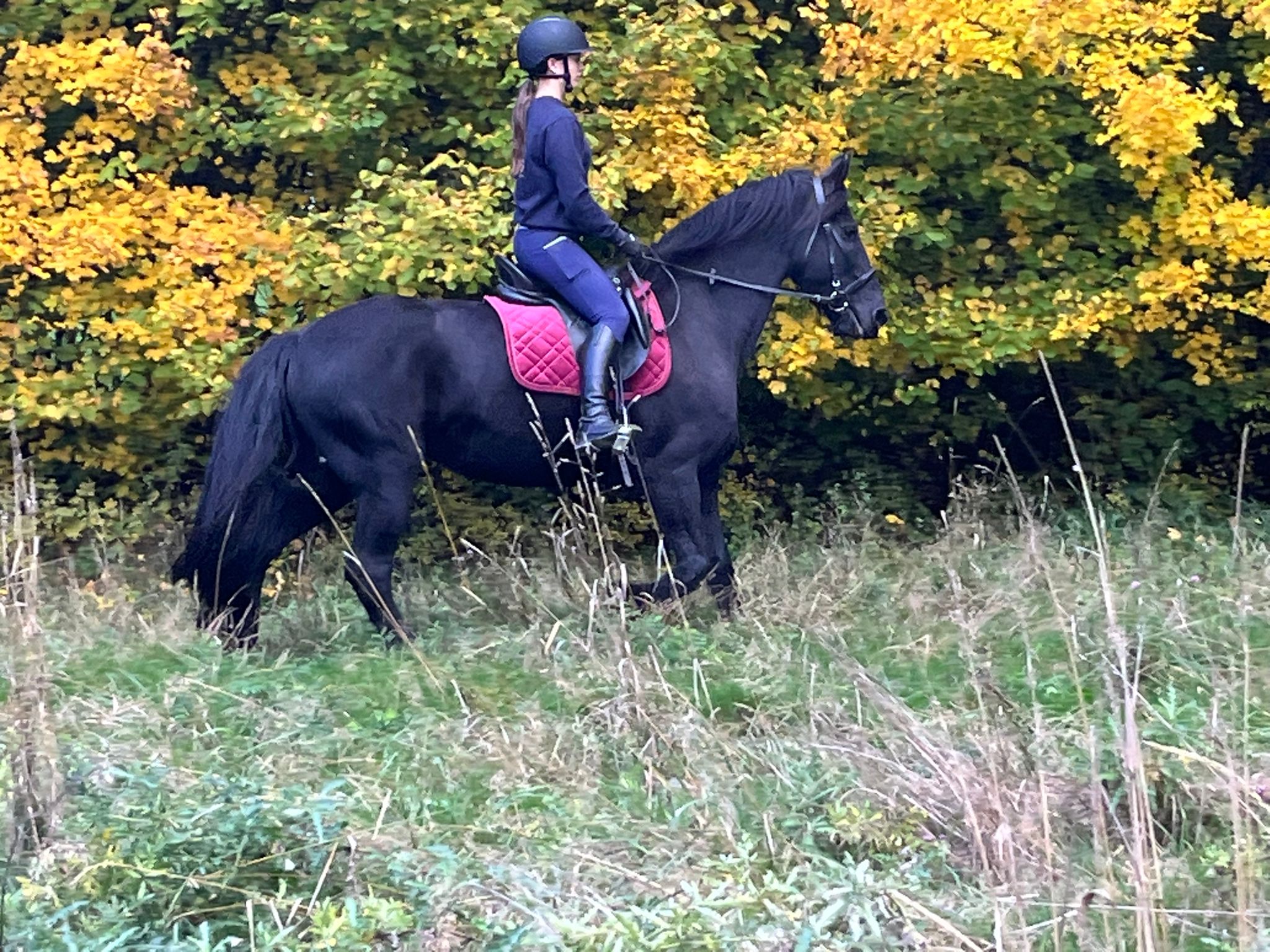 geb. 2014, ein sensibles Pferd. Ihre Stärken: Dressur, Springen, Gelände. Sie ist manchmal temperamentvoll.